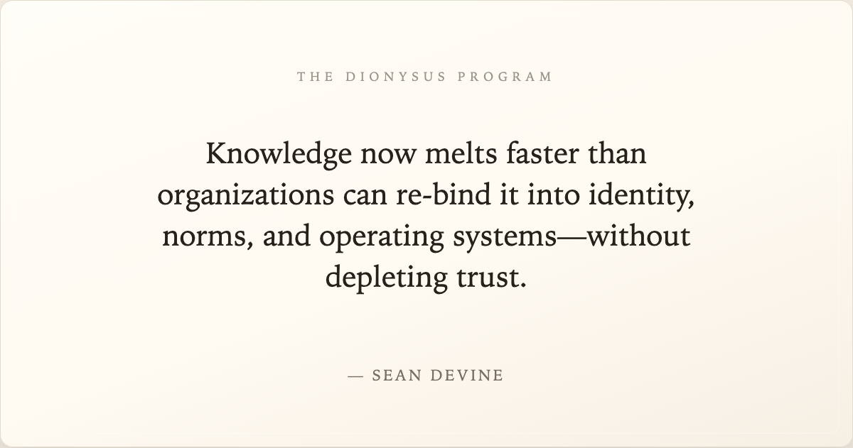 Knowledge now melts faster than organizations can re-bind it into identity, norms, and operating systems—without depleting trust.
