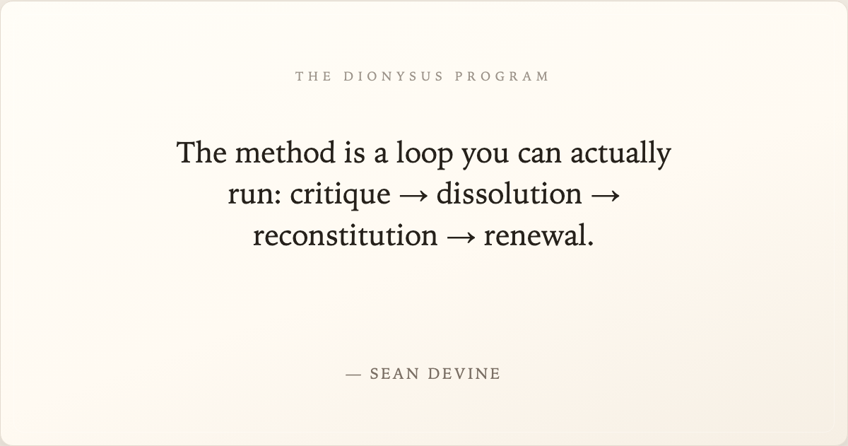 The method is a loop you can actually run: critique → dissolution → reconstitution → renewal.