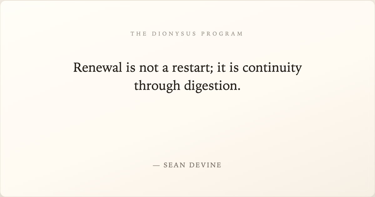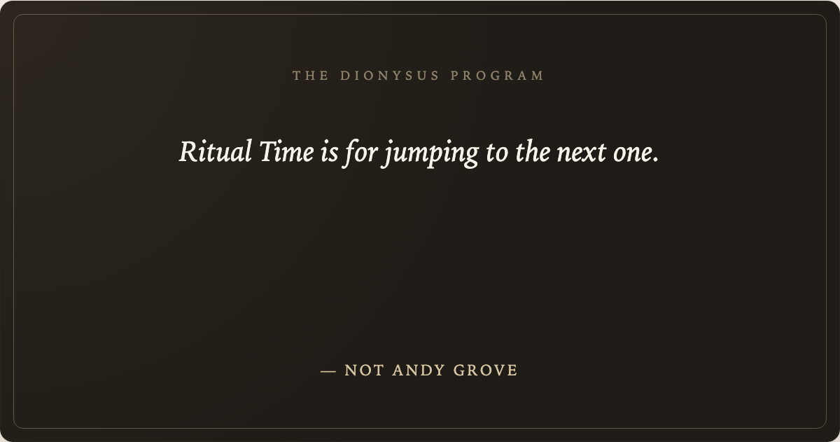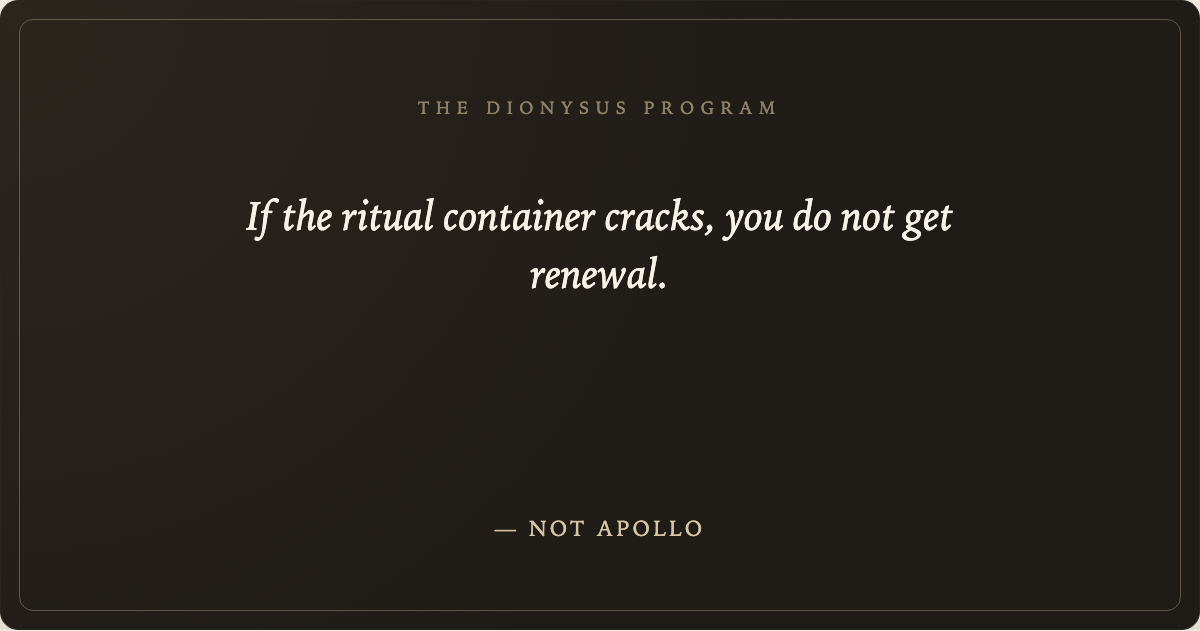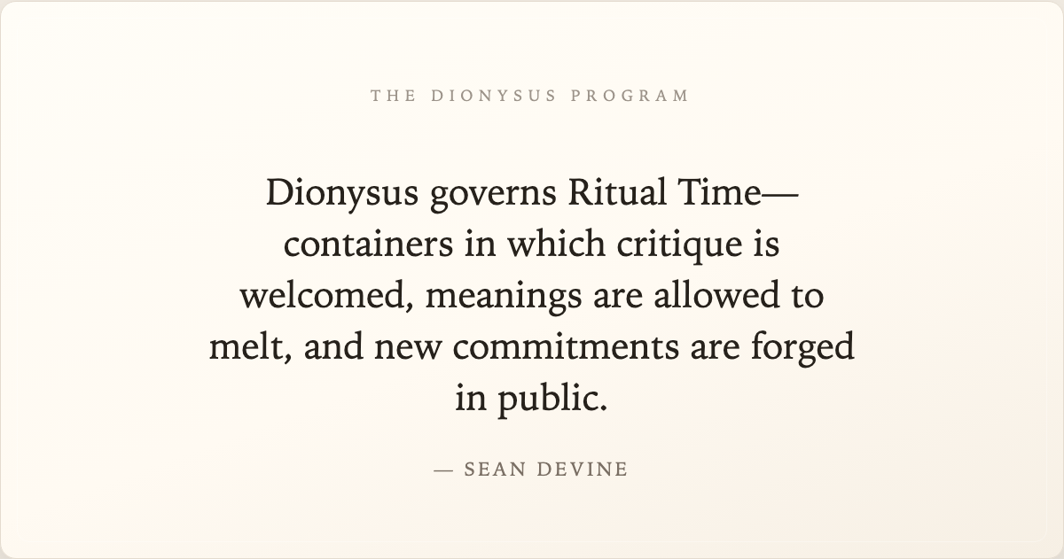 Dionysus governs Ritual Time—containers in which critique is welcomed, meanings are allowed to melt, and new commitments are forged in public.