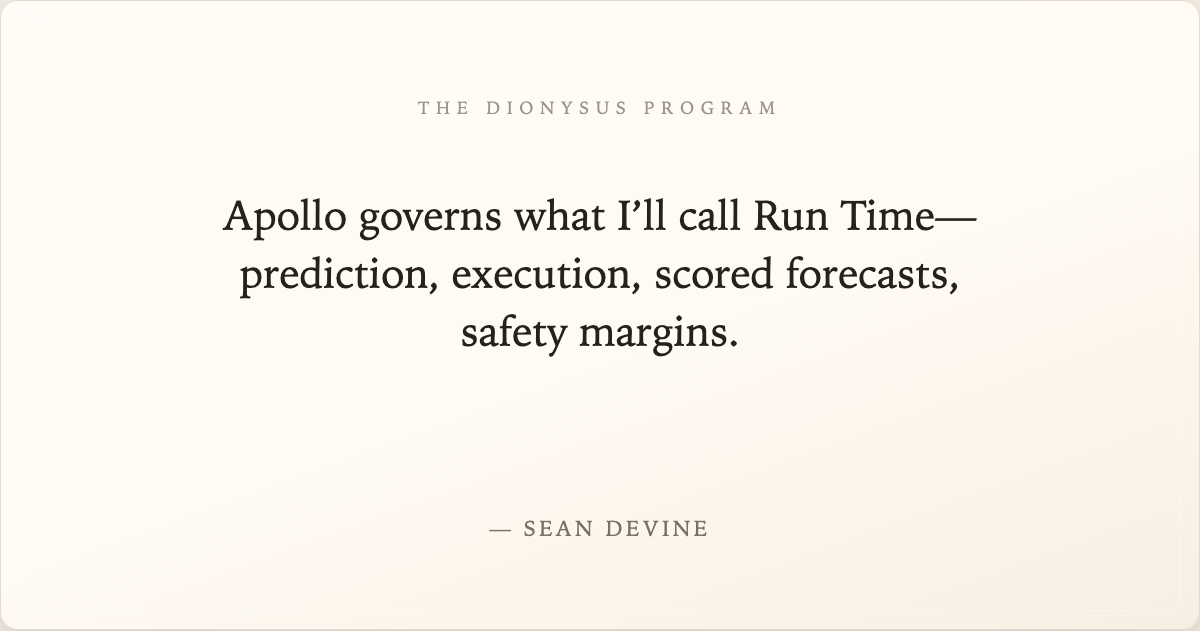 Apollo governs what I’ll call Run Time—prediction, execution, scored forecasts, safety margins.