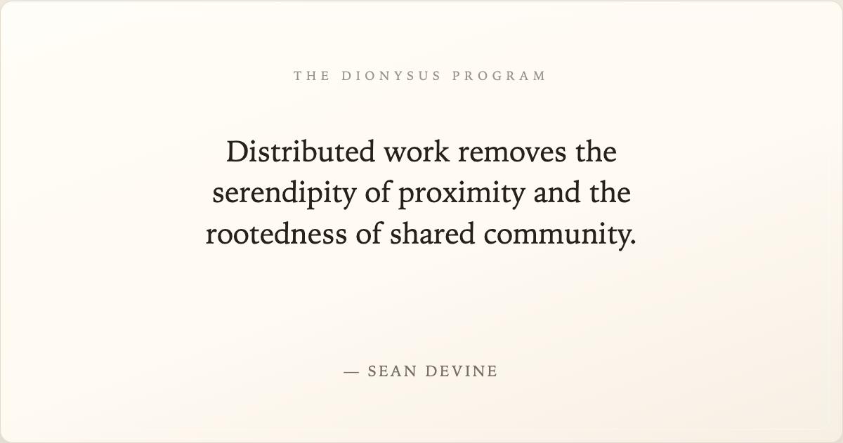 Distributed work removes the serendipity of proximity and the rootedness of shared community.