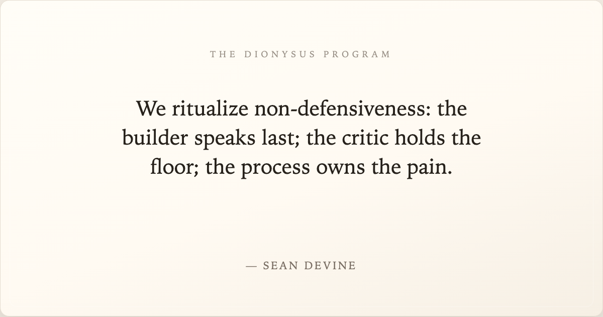 We ritualize non-defensiveness: the builder speaks last; the critic holds the floor; the process owns the pain.