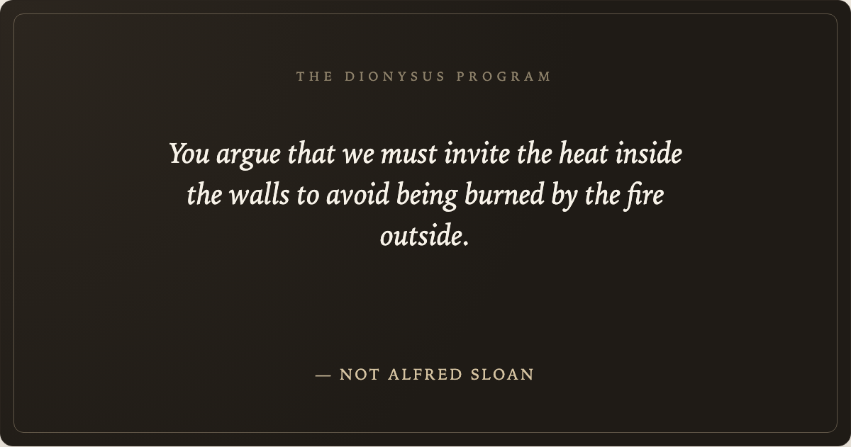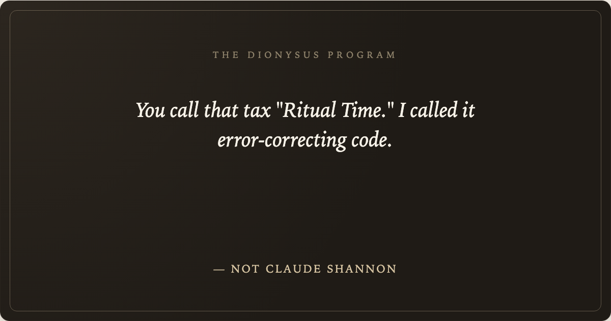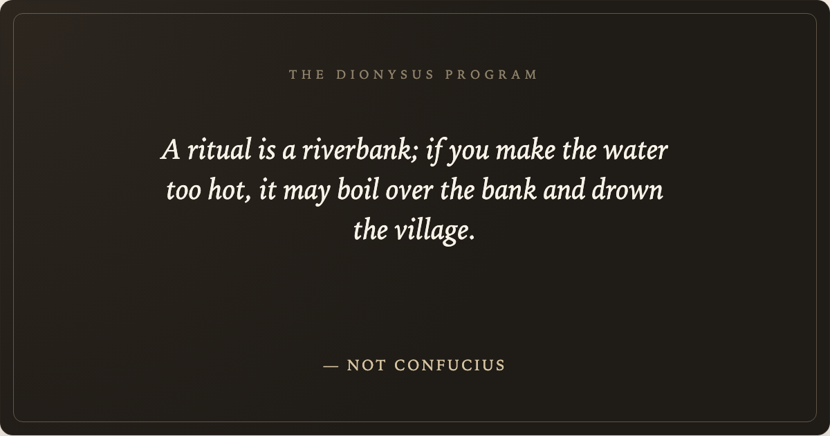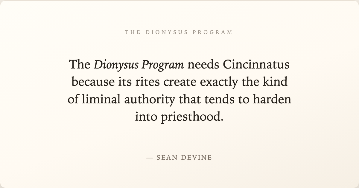The Dionysus Program needs Cincinnatus because its rites create exactly the kind of liminal authority that tends to harden into priesthood.