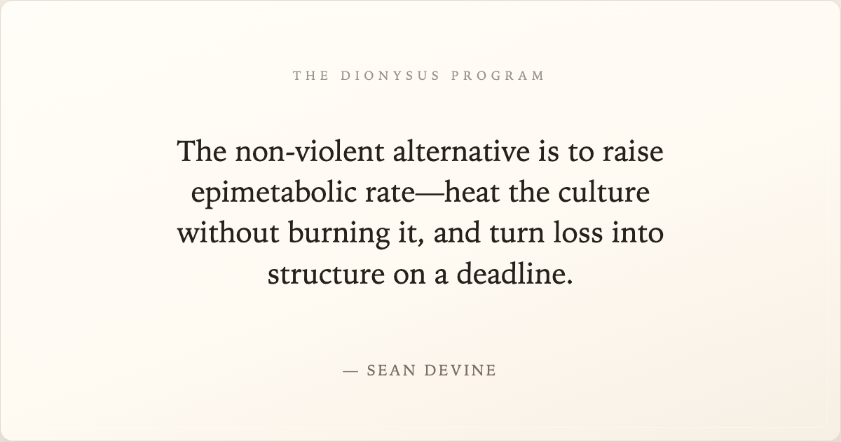 The non-violent alternative is to raise epimetabolic rate—heat the culture without burning it, and turn loss into structure on a deadline.